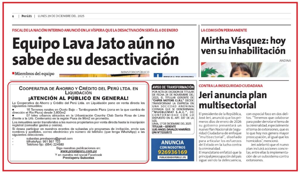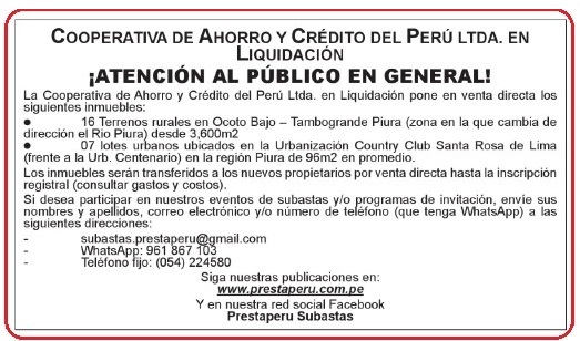 Se pone en conocimiento de los socios de PRESTAPERU en Liquidación y del público en general, que dentro del proceso de liquidación de la Cooperativa, se ha dispuesto continuar con la venta de bienes inmuebles a través del Programa de Invitación a Ofertar N°01-2026-PRESTAPERU-LIQ., Subasta Pública N° 01-2026-PRESTAPERU-LIQ., Subasta Pública N° 02-2026-PRESTAPERU-LIQ. y Subasta Pública N° 03-2026-PRESTAPERU-LIQ., cuyas bases adjuntan al presente Comunicado, es publicada en la página web de la Cooperativa.