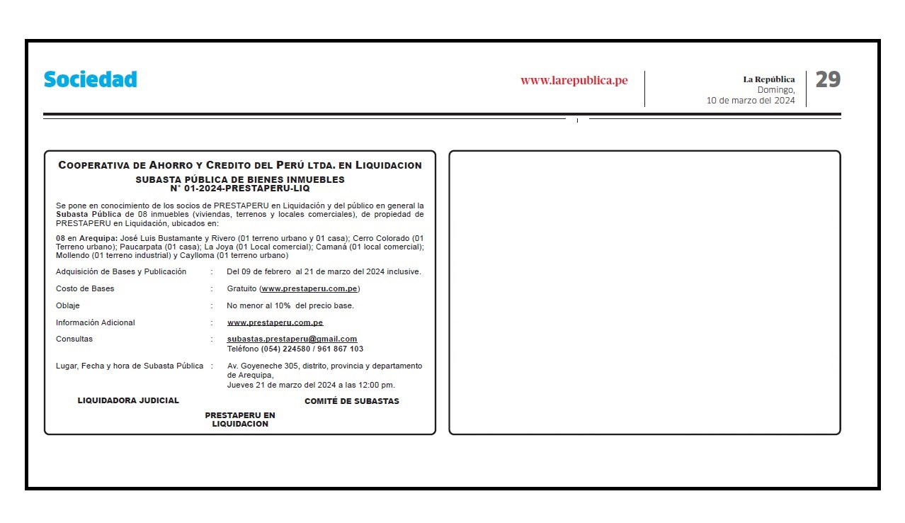 Se pone en conocimiento de los socios de PRESTAPERU en Liquidación y del público en general, que, dentro del proceso de liquidación de la Cooperativa, se ha dispuesto continuar con la venta de bienes inmuebles a través de la Subasta Pública N° 03-2024-PRESTAPERU-LIQ, cuyas bases adjuntas al presente Comunicado son publicadas en la página web de la Cooperativa.